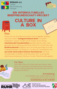 Freuen wir uns nicht alle noch immer, auch im digitalen Zeitalter, über einen netten, handgeschriebenen Brief in unserem Postkasten? „Culture in a Box“ ist ein Projekt, durch welches interkulturelle Freundschaften gefördert werden sollen. Dies geschieht durch Zuteilung eines*einer Partner*in mit dem*der eine Brieffreundschaft aufgebaut wird. Die Zuteilung erfolgt durch die Projektkoordination von Ronahi e.V. So könnt Ihr unkompliziert und aus erster Hand andere Kulturen Kennenlernen und neue Freundschaften schließen. Ende November 2021 ist eine große Abschlussveranstaltung in Bochum mit allen Teilnehmenden geplant.